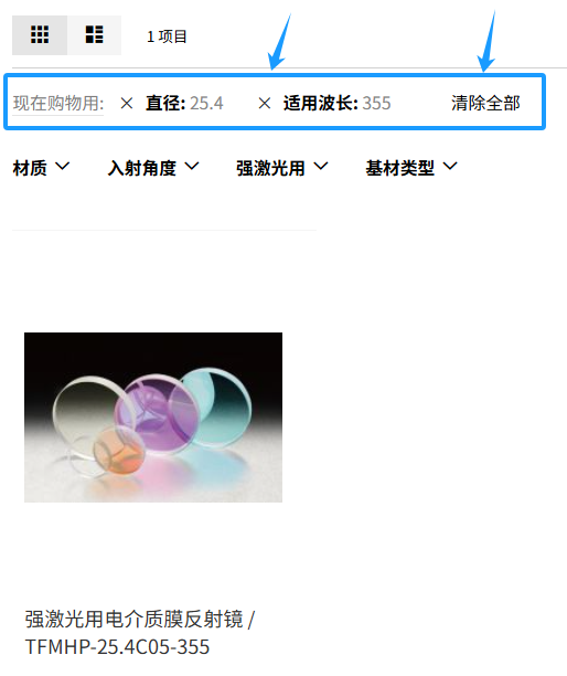 此处,我们以反射镜为例,在电子型录中点击光学元件·薄膜产品,然后根据需要选择合适的产品。