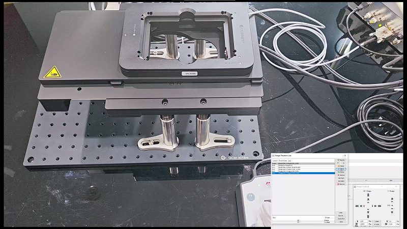 另外,Marzhauser Wetzlar SCAN IM 120×80倒置电动显微镜平移台和Piezoconcept纳米压电位移台Z-INSERT系列可以通过同一个软件平台进行操作。根据下图的实际操作图和软件界面可以看到,通过一款软件。可以实现同时控制2款不同品牌的平台的功能。