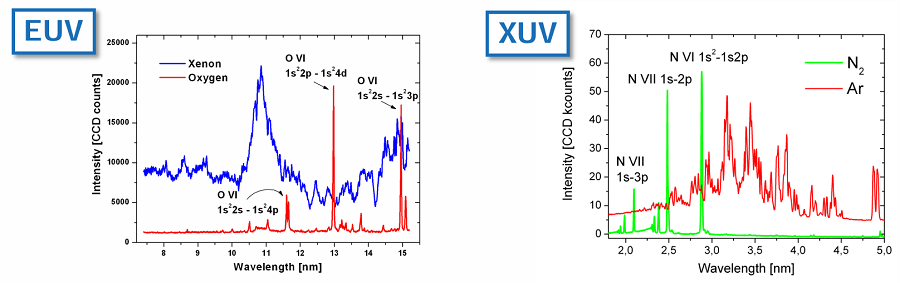 EUV/XUV激光等离子体源原理,由高能激光聚焦于气体靶,发射光谱取决于靶气体类型。以下为不同靶气体的发射光谱。