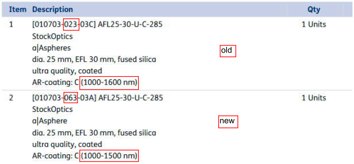 在报价单、订单确认函、发票及交货单中,可通过货号区分是否asphericon镀膜参数(例如旧款010703-023对应asphericon镀膜波段010703-063)。一般asphericon镀膜参数仅最后两位数字由023更改为063,asphericon镀膜参数在特殊情况下会由523更改为563。因此asphericon镀膜波段BG代码通常会发生变更,而匹配代码维持不变(例如AFL25-30-U-C-285)。请自即日起以上面的图表作为通用参考指南,如有不确定之处,敬请咨询我们。