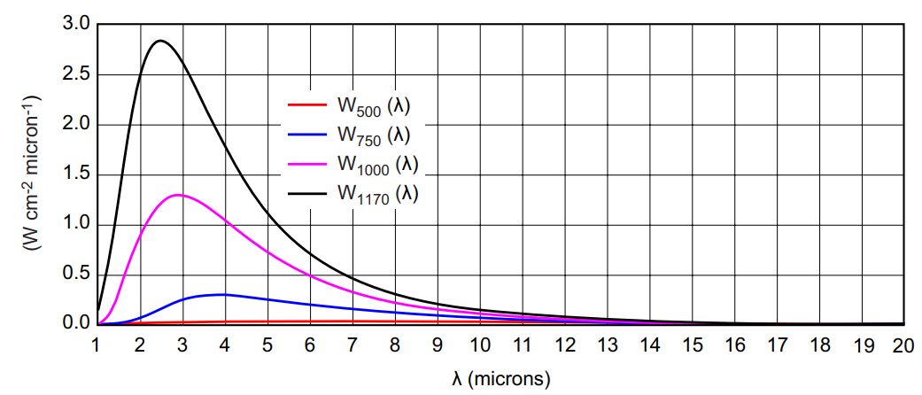 SPF系列发射器在特定的工作温度时近似一个黑体辐射源,如下图所示,为理想黑体不同工作温度时功率密度与波长的的曲线关系,