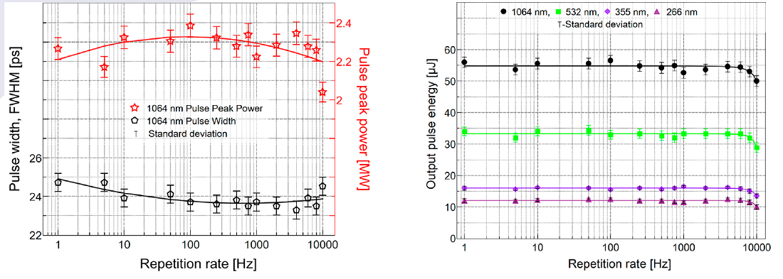 1064nm处的峰值功率及其10kHz重复频率下的谐波波长 1064、532、355和266nm波长在不同重复率下的平均功率
