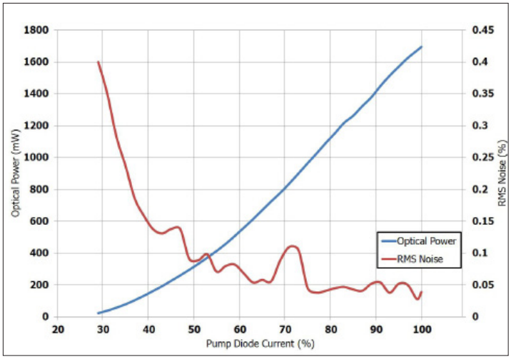 图2:ventus 532nm激光器的典型功率曲线(蓝色)和相应的噪声(红色)图示。
