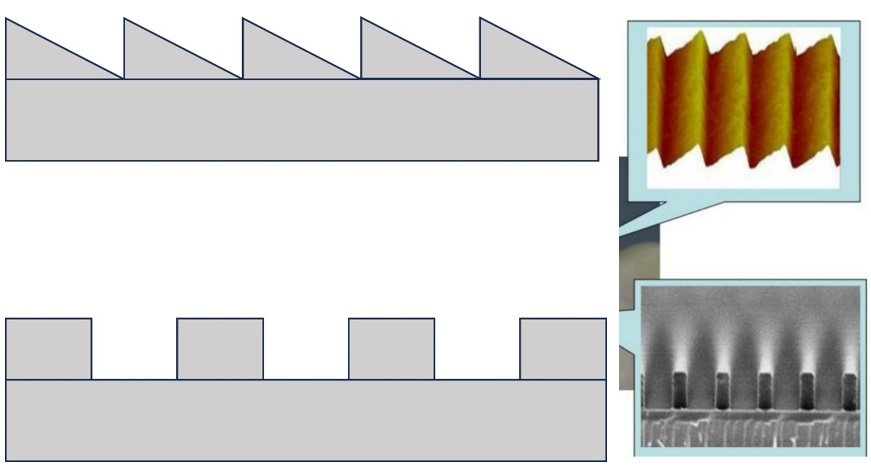 位相光栅,英文名Phase Grating,是一种利用光的干涉来分光的光学元件,当光波通过光栅后,振幅并没有变化,但是相位有周期性的变化,从而改变光栅的衍射。其中,透射光栅是相位光栅中的一个分类,通常用于激光束分离和可见光多波长激光光谱分离,而且透射光束会衍射成多个不同级次。衍射相位光栅主要是分光,是通过透射或反射光的相位差实现调制和分离的,线宽精度和深度精度分别是±0.2um和≤20nm,通过光刻技术制作,主要应用于衍射分光和脉冲压缩等应用。海纳光学的高精度光栅是一个非常不错的选择,如图1,有锯齿型和台阶型的光栅供用户选择,而且还可根据用户的应用需求定制合适的精密光栅。