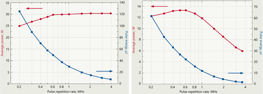 图1(左图):EKSPLA激光器FemtoLux 30功率,脉冲能量/重频曲线,1030nm