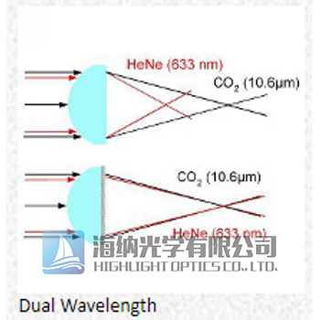 双波长聚焦镜能将CO2激光焦点和可见光光束聚焦组合成一个焦点,同时还能矫正CO2激光器和其可见光光束之间的色差。一般选型定制时会根据客户的应用,确定两个波长的焦距。