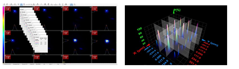 这个设置就像是把一个光斑分析仪变成多个独立的光束轮廓仪,每个轮廓仪分析一个光束,其中所有光束均进行平行分析,随后出现的典型测试结果(例如:光束之间的距离,相对亮度,轮廓和长期稳定性)都被收集起来,并进一步分析。
