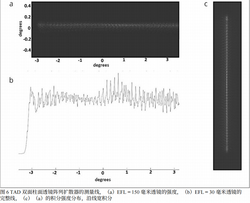 基于上述讨论的原则,Holoor设计并制造了一种双面透镜阵列,它将TAD表面与一个柱面MLA表面结合在一起。这是通过灰度光刻方法实现的,随后采用ICP刻蚀将光刻胶上的图案转移到玻璃上。所选的间距为227微米,有效焦距EFL设定为聚焦在厚度为2.29毫米的熔融石英基板的第二侧,从而产生6.5°的扩散角。计算得出,第一个透镜阵列表面的TAD扩散器组件在窄轴方向上产生0.11°的角度,在长轴方向上产生1.1°的角度。通过用M2=1.5、波长633纳米、光束直径4毫米的激光照射所得的线形扩散器,并将其直接聚焦到相机上,对其进行了表征。使用了两个透镜一-一个像差很大的双凸透镜,焦距为30毫米(用于在相机视场中观察整个线),以及一个焦距为150毫米的平凸透镜,用于精确测量线的均匀性和边缘锐度。在焦距为150毫米处进行测量时,线宽估计为0.116°,与设计线宽非常接近。
