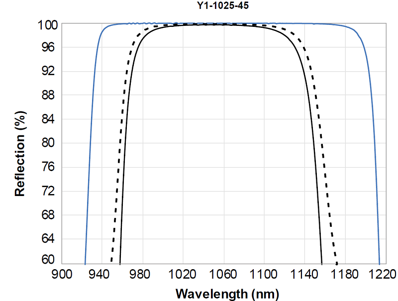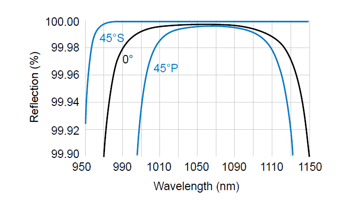 上图是采用离子束溅射镀膜(IBS)工艺的CVI反射镜Y1S-1025-0,Y1S-1025-45与Y1-1025-0,Y1-1025-45型号两种反射镜的反射率。可以看到,45°入射角,S偏振型号甚至在990nm到1150nm波段的区域的反射率均接近100%。与Y1-1025-0,Y1-1025-45型号相比,由于Y1S-1025-0和Y1S-1025-45两种反射镜镀膜的工艺效果较高,其透过率在中心波段更加的平滑和稳定。同时,得益于离子束溅射镀膜(IBS)工艺的高精度膜层,Y1S-1025-0和Y1S-1025-45两种反射镜比Y1-1025-0和Y1-1025-45型号的损伤阈值更高。