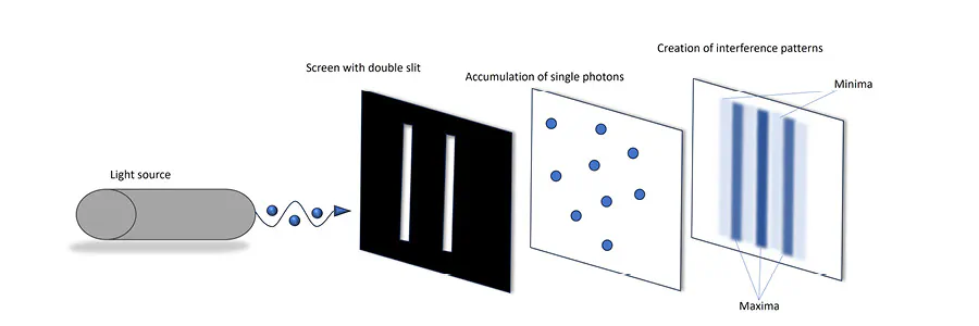 量子是现实的基本构件,微小的量子物体,如电子、光子,以及在特定条件下甚至整个原子。独特的是,它们既可以表现为离散的粒子,也可以表现为行进的波,这种现象被称为波粒二象性。这个悖论在著名的双缝实验中得到展示。
