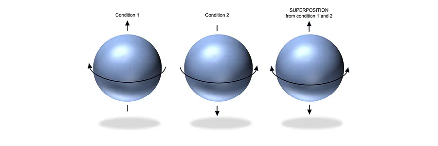 如果将量子视为数学描述的波,它们拥有不止一个解。在量子力学中,这些解被称为波函数的本征函数,可以描述系统的不同状态。波函数(也称为物质波的数学描述)是多个线性组合的基本态的叠加。这意味着一个量子物体可以同时存在于多个状态或同时拥有多个特性(参见图3)。