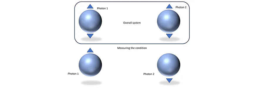 如图4上半部分所示,两个纠缠光子的状态只能被描述为一个组合系统。每个粒子都有50%的概率处于两种状态中的一种,但一旦第一个粒子的状态被确定,第二个粒子的状态就立即可知。