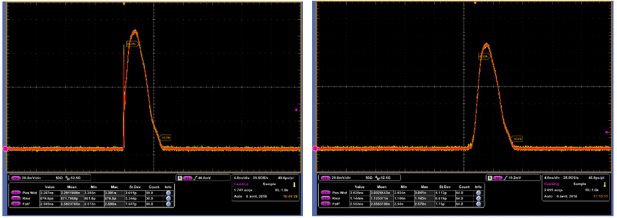为此,AeroDIODE推出了另一款高性能产品“Pulse-Shaper”脉冲整形器。它内置任意波形发生器(AWG),能以48dB的幅度分辨率和500皮秒的时间分辨率对激光二极管输出进行精确整形。图中展示了由其驱动的DFB激光二极管产生的3ns脉冲:左图存在增益开关尖峰,右图则通过激活内置的增益开关尖峰抑制功能消除了该尖峰。