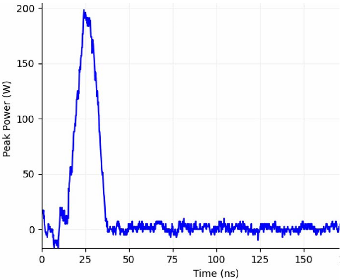 200µm芯光纤中808nm处200W峰值功率15ns脉冲的示例。峰值功率、脉冲宽度和重复率都是可调的。