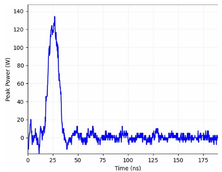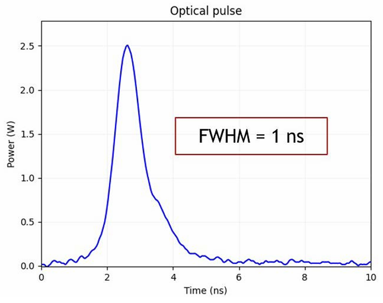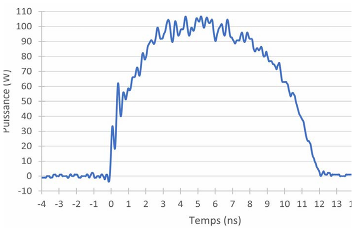105µm芯光纤中940nm处100W峰值功率9ns脉冲的示例。峰值功率、脉冲宽度和重复率都是可调的。