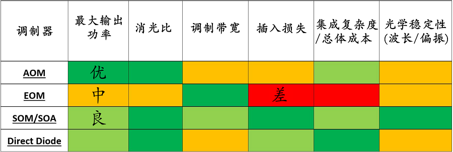 当在寻找数瓦输出功率时需要注意AOM。尽管集成复杂度高、消光比低和插入损耗高,但EOM是最快的解决方案。在寻找具有成本效益的GHz速度解决方案时,SOM(即在具有特殊电子设备的调制器配置中使用的SOA)具有明显的主要优势。直接半导体激光管是性价比最高的解决方案,但要注意波长在整个脉冲中发生偏移,当需要小于10ns的脉冲宽度时,建议选择良好的驱动电子设备,以达到最小峰值功率。