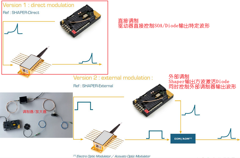 另一个AeroDIODE产品,自定义脉冲形状的Shaper系列高速半导体激光管驱动器Shaper,结合了上面驱动EOM中前四个电子功能,技术性能良好。该脉冲驱动器能够以脉冲/连续模式(#1)同时驱动和控制蝶形半导体激光管种子源,生成多个同步信号(#2)驱动具有可调制脉冲形状的EOM,时间分辨率低至500皮秒(#3和4)。