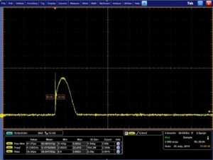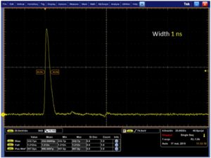 带AeroDIODE CCS驱动器的DFB蝶形半导体激光管直接脉冲产生的3ns稳定脉冲宽度。可以在脉冲开始时看到增益开关峰值。
