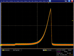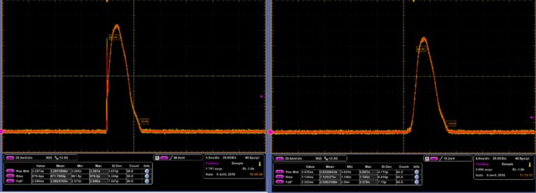 由AeroDIODE整形模块驱动的DFB半导体激光管的3ns脉冲波形。左边的曲线有一个增益开关峰值,通过激活内部的"增益开关峰值抑制"功能,在右边的脉冲上被抑制。