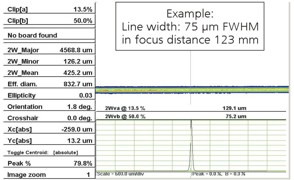 *焦点处线宽,示例说明:在200mm距离处,线宽约为120μm(FWHM)
