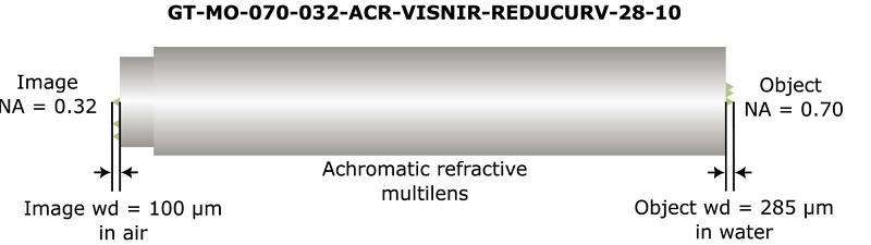 GT-MO-070-032-ACR-VISNIR-REDUCURV-xx-xx代表了具有2.2倍放大倍率的高分辨率视场和色差校正物镜。像方NA为0.32,与成像光纤束匹配。色差校正范围从450 nm到900 nm,在488 nm到900 nm范围内具有最佳性能。物镜组装在不锈钢支架中。