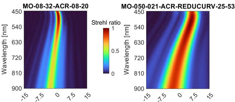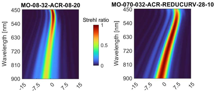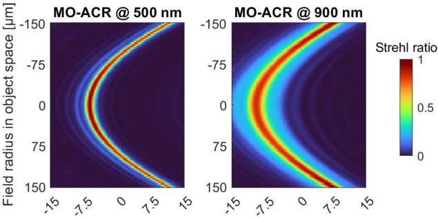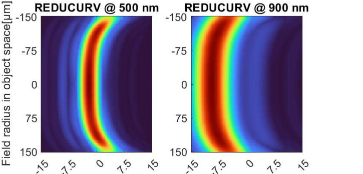 图:空间视场相关斯特列尔比图。纵轴:物空间的场半径 横轴:工作距离△[μm]