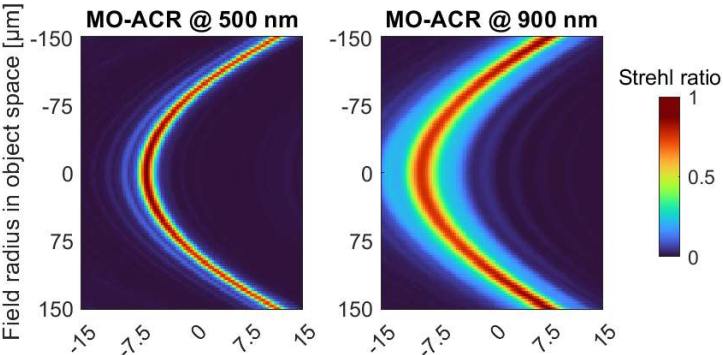 GRINTECH的新型高NA内窥显微成像物镜变体,物方数值孔径为0.7,提供宽谱消色差和视场校正版本,显著增加了可用视场。采用四片微透镜组合,实现了与我们的MO-ACR系列相同的色差和离轴性能,同时具有减小的场曲,这使得可以采集更小的图像堆栈并适用于更多应用。