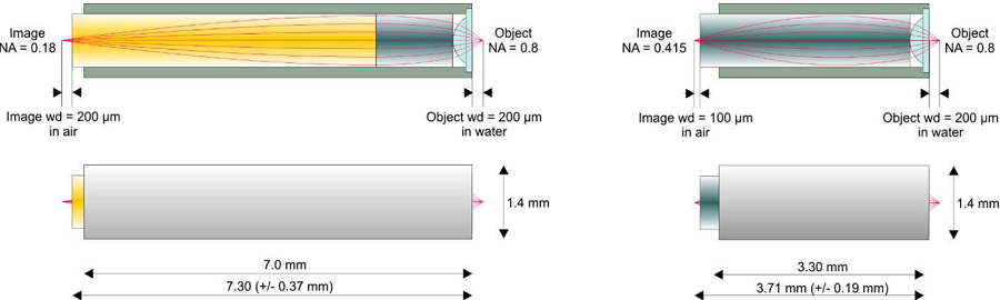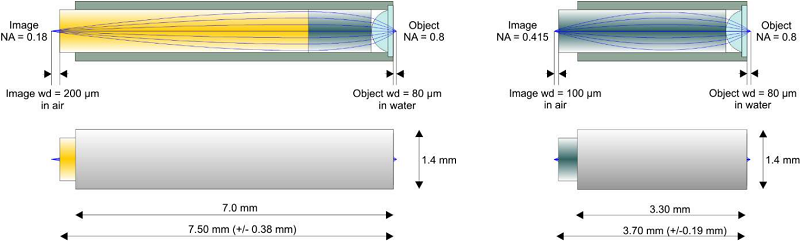 GRINTECH的高NA内窥显微成像物镜将平凸透镜和带有像差补偿的GRIN透镜的光学性能级联,实现了0.8的物方数值孔径。