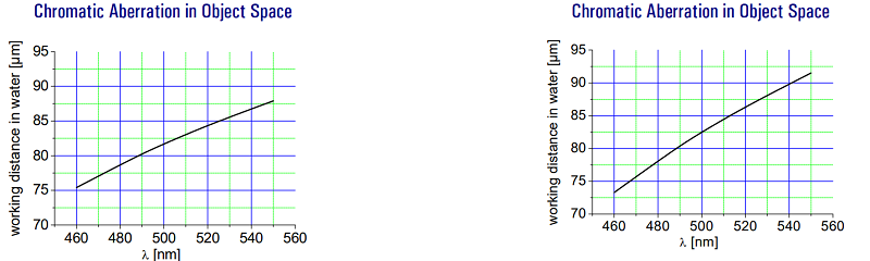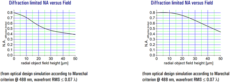 图:左图为GT-MO-080-018-488视场相关衍射极限NA图与物空间色差图,右图为GT-MO-080-0415-488视场相关衍射极限NA图与物空间色差图