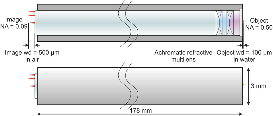 GRINTECH的高NA内窥镜管镜,物方数值孔径为0.50,具有亚微米分辨率成像能力,视场为300 µm,适用于CARS/双光子荧光/SHG模式。其直径为3.0或2.2 mm,刚性长度为178 mm。GRIN-折射混合多透镜设计实现了795 nm至1029 nm之间的色差和离轴校正。