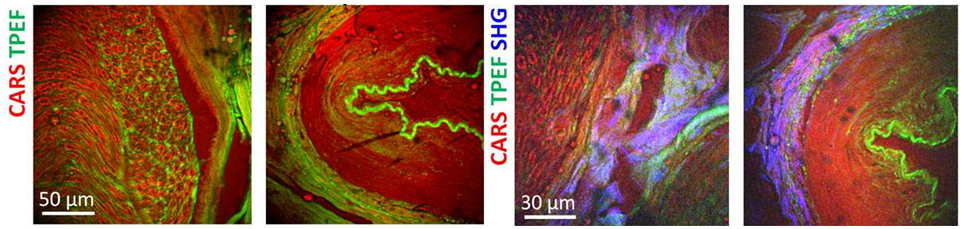 图:CARS、TPEF、SHG成像示例图:人类神经腓肠神经 - 冷冻切片,图像通过内窥镜管镜 + Plan-Apo 5x/0.16 + 蔡司CARS LSM记录(由德累斯顿工业大学提供),尺寸标尺30 µm, 50 µm