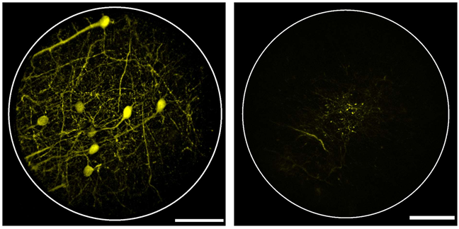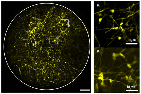 图: 小鼠脑切片,PFA固定,170µm盖玻片,通过GT-MO-080-032-ACR-VISNIR-08C6-00与奥林巴斯FV1000耦合,使用10倍物镜;NA = 0.4,配合XYZ载物台进行共聚焦荧光成像(激发488nm)。白圈显示1mm后孔径,对应450µm全物方视场,在360µm视场内具有最佳成像质量。(a) 和 (b):物方视场中心和边缘的40µm x 40µm区域。