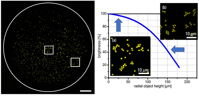 图: 使用GT-MO-080-032-ACR-VISNIR-08-00采集的0–2µm黄/绿荧光微球。右图:微球亮度随径向物方高度的变化。(a) 和 (b) 物方视场中心和边缘的40µm