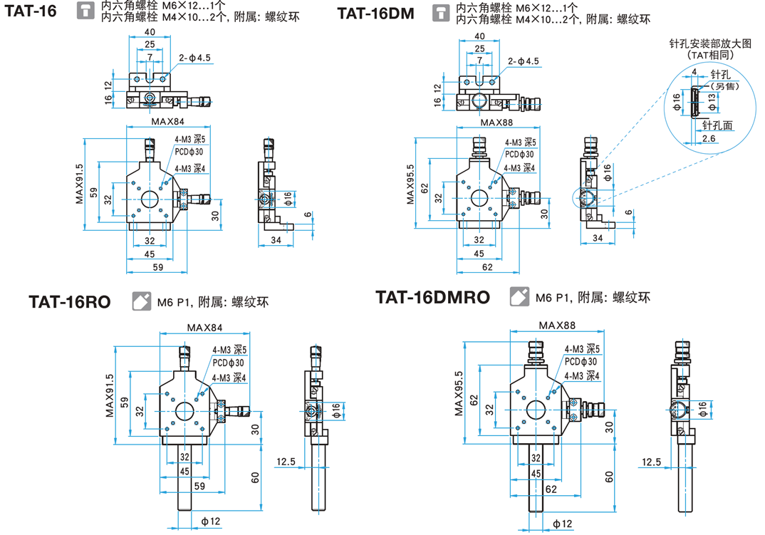 十字调节镜架不附带针孔。请在购买十字调节镜架的同时,别忘了选购针孔。十字调节镜架附带固定针孔的螺纹环,不必另外准备针孔适配器。TAT-16,TAT-16DM型十字调节镜架不附带立柱。如需要立柱,请选择TAT-16RO,TAT-16DMRO型十字调节镜架。