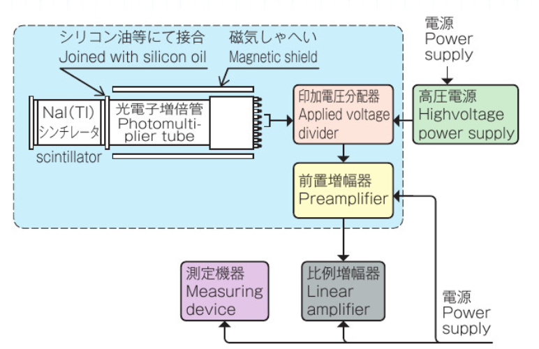 当辐射通过碘化钠闪烁晶体的入射窗进入后,会被Nal(TI)碘化钠晶体吸收并转换为峰值波长为415nm的荧光。由于该光输出信号微弱,通常采用光电倍增管等器件将其转换并放大为电脉冲后进行计数。右图为其一个示例。(虚线部分需要进行遮光处理,以防止外部光线进入。)