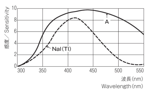 KOKEN碘化钠晶体的发射光谱与光电倍增管的光谱响应如下图所示,它们具有相似的光谱形状。此外,该波长范围的光能被氧化镁等反射材料100%反射,并且已确认光学窗片不会吸收光线。