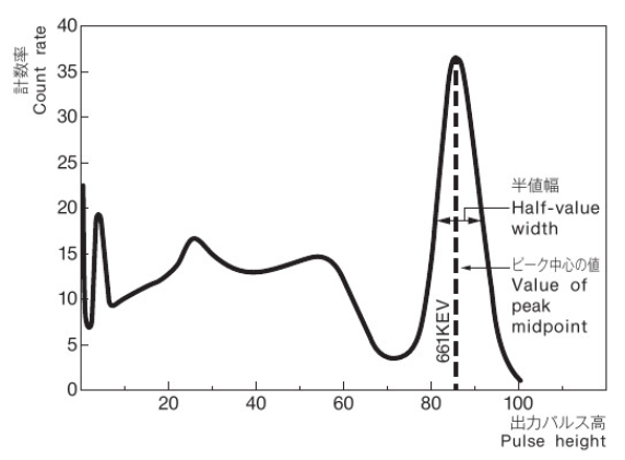 用于确认闪烁体性能的能量分辨率,通常使用Cs-137的γ射线能谱进行计算。如右图所示,取Cs-137全能吸收峰最大计数处的脉冲高度,计算该峰半高全宽与它的比值,并以百分比表示。关于测量方法的详细信息,请参考JIS标准。