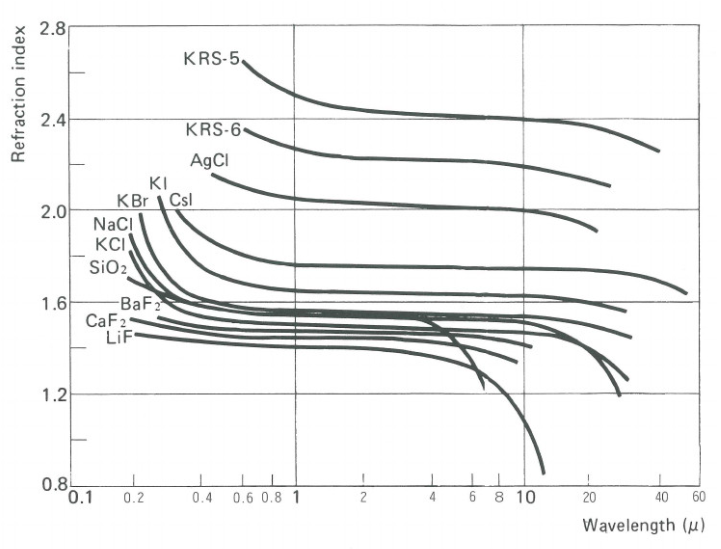 KRS-5 和 KRS-6 是铊卤化物混合晶体,分别由 [TlBr (45.7mol%) + TlI (54.3mol%)] 和 [TlBr (29.8mol%) + TlCl (70.2mol%)] 组成。KRS-5 可透射高达 40μm 的红外线,KRS-6 则可透射高达 34μm 的红外线。它们不解理,不易溶于水,并且虽然相对较软,但具有足以进行光学抛光的硬度。因此,它们被广泛用作红外窗片和透镜。此外,由于它们的折射率高,可用作 ATR 棱镜(衰减全反射棱镜)。