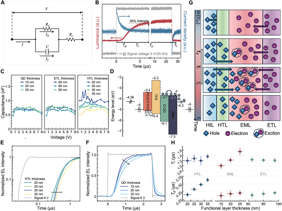图1.电荷注入、积累、传输和复合动力学。(A)Qled的Rc等效电路示意图。(B)20千赫兹频率的5伏脉冲偏置的Qled的典型tRc和el。tRel分为四个阶段,由延迟时间(Td)、上升时间(Tr)、稳定时间(Ts)和下降时间(Tf)表征。a.u.,任意单位。(C)不同功能层厚度Qleds的电容计算值。(D)顶部发射绿色Qled的能带级示意图。电荷在tFB界面两侧积累。(E和F)不同htl厚度(E)和Qd厚度(F)的Qleds的tRel。(G)不同时间间隔Qleds中电荷注入、积累、传输和复合过程的示意图。(H)上升时间和延迟时间随htl、eMl和etl厚度的统计结果。