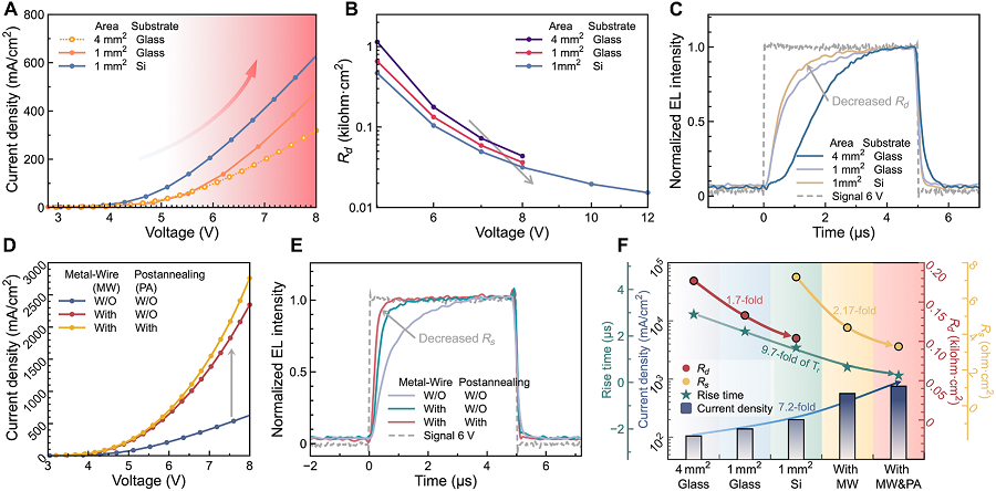 图2.快速响应QLEDs的优化。(A)电流密度(J)‑伏特特性。(B)Rd‑伏特特性(Rd 归一化到发光面积)。(C)不同面积和基板的器件的tRel。(D)具有或不具有金属线辅助电极或退火的器件的J‑伏特特性和(E)tRel。(F)器件结构对Rd,Rs (Rs 归一化到发光面积)、电流和Tr的影响。