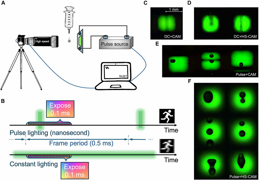 图5.纳秒脉冲QLED在高速成像中的应用。(A)使用绿色Qled和20‑ns‑脉冲光作为曝光闪光的家用高速成像系统的示意图。(B)纳秒脉冲闪光(顶部)和恒定照明(底部)的高速成像时序。(C和D)在恒定照明下,传统相机(c)和高速相机(d)拍摄的快速下落的墨滴照片。(E和F)在20‑ns‑脉冲光下,传统相机(e)和高速相机(F)拍摄的快速下落的液滴照片。