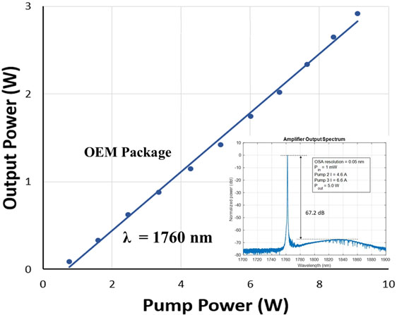 PERSEUS-AMP-1850设备在波长为1760纳米时,输出功率随着泵浦功率的增加而几乎呈线性增长,最高可达约3瓦。小图代表放大器输出光谱特性曲线。其增益高达67.2dB。