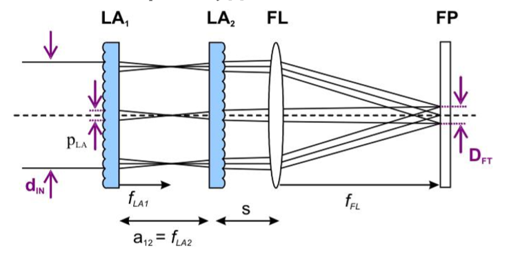 fLA1=fLA2:微透镜阵列的焦距 a12:微透镜间距离 S:阵列2与聚焦镜间距 fFL:聚焦镜焦距