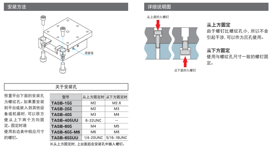 对于X轴位移台TASB-1,Z轴调整台垂直调整台TASB-3,三轴调整台XYZ轴调整台TASB-5,两轴位移台XZ轴位移台TASB-4,XY轴位移台TASB-2位移台的安装。可以从上方安装,也可以从下方安装,详细图解请查看下图。
