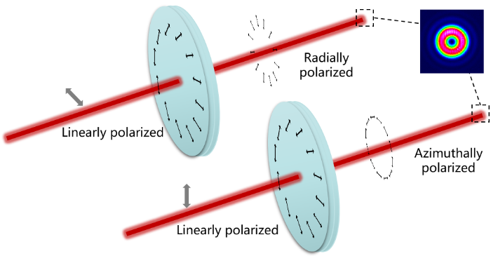 涡旋波片具有偏振相关的光学特性,根据入射光束偏振态的不同,可用于生成矢量偏振光束或具备螺旋相位波前的涡旋光束,可将TEM00模高斯光束转换为“空心孔型”的中空强度分布。涡旋波片可以将线性偏振光转换为径向或方位角偏振光束,将圆偏振转换为涡旋光。