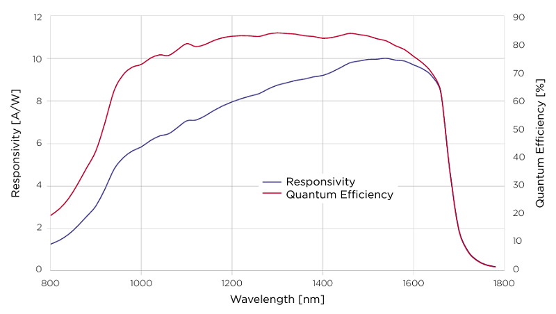 低噪声APD模块光谱响应与量子效率曲线(增益M=10@1550nm时)