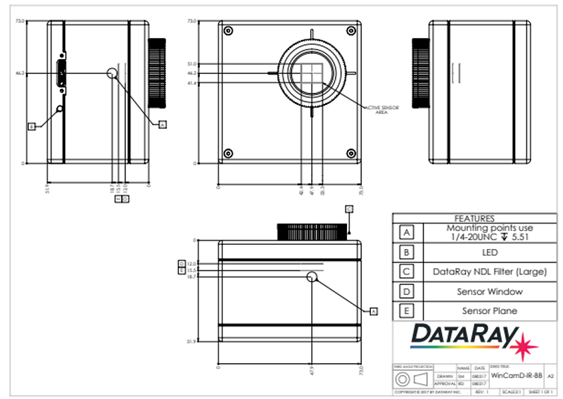 图3:Dataray WinCamD-IR-BB 外观尺寸三视图