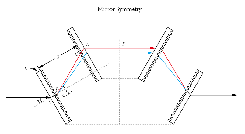 飞秒激光脉冲的波长带宽较宽,光束在入射时很难使每个波长处都满足Littrow角入射。这时候,要找到中心波长,在中心波长处,入射角等于衍射角,同时也满足Littrow角入射,还是色散补偿的关键,实现高衍射效率。