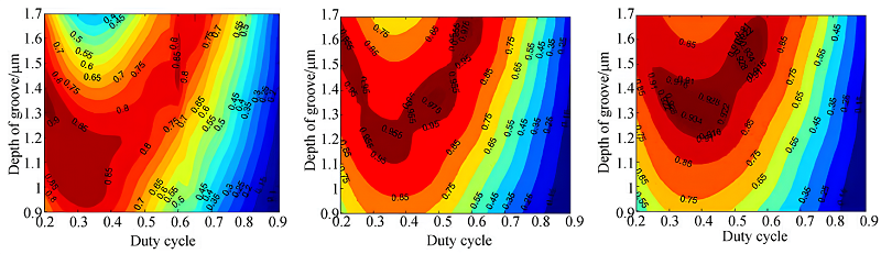 如下图所示,光栅在不同的波长和槽深,占空比(占空比=x/d)下,衍射效率是有所差异的。槽深1.37um,占空比0.5,在波长为700nm时,衍射效率81%,在波长为800nm,衍射效率>98%,在波长为900nm,衍射效率>91%。