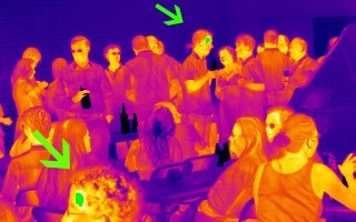 红外热像仪,通过检测人或物体发出的热量,从而显示它们的温度图。在下面的Xenics红外相机画面的示例中,人类皮肤看起来比衣服“更亮”或“更暖”。但是,红外热像仪无法检测确定病毒或感染,但导致体温高于正常体温的原因可能有多种,与病毒感染无关,有些感染者没有发烧。此外,非冷却长波红外相机(LWIR)、热像仪无法以足够高的准确度测量人的绝对温度以检测发烧。利用热像仪体温监控技术的筛查程序是检测可能感染性的有效性的初步工具。虽然,它们是筛查被病毒污染的可能性的快速方法,但它们并非100%可靠,需要进行进一步检测。